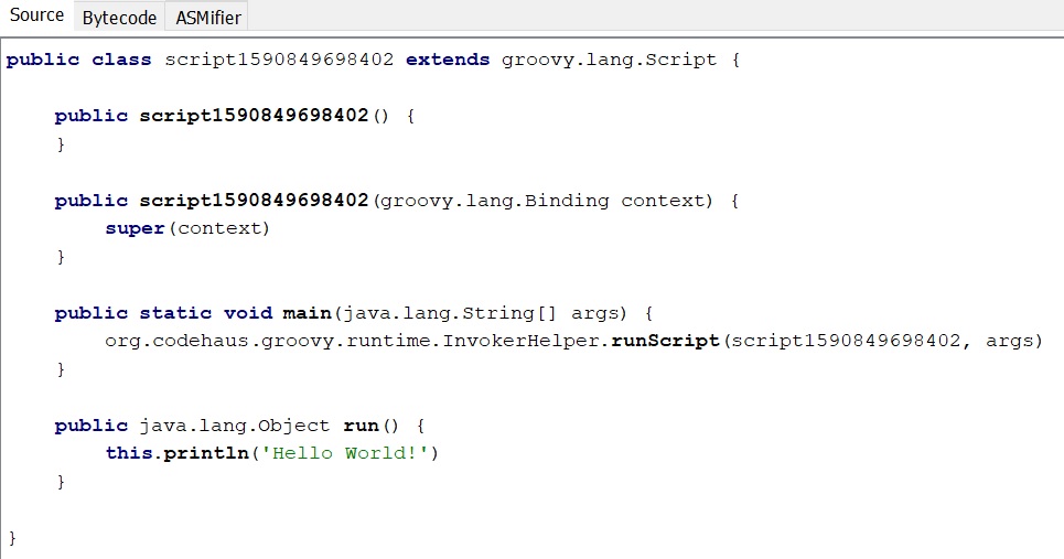 | Groovy script | #!/usr/bin/groovy println "Hello World!" Note: below is the compiled code looking via a the Groovy console AST browser ![]() |