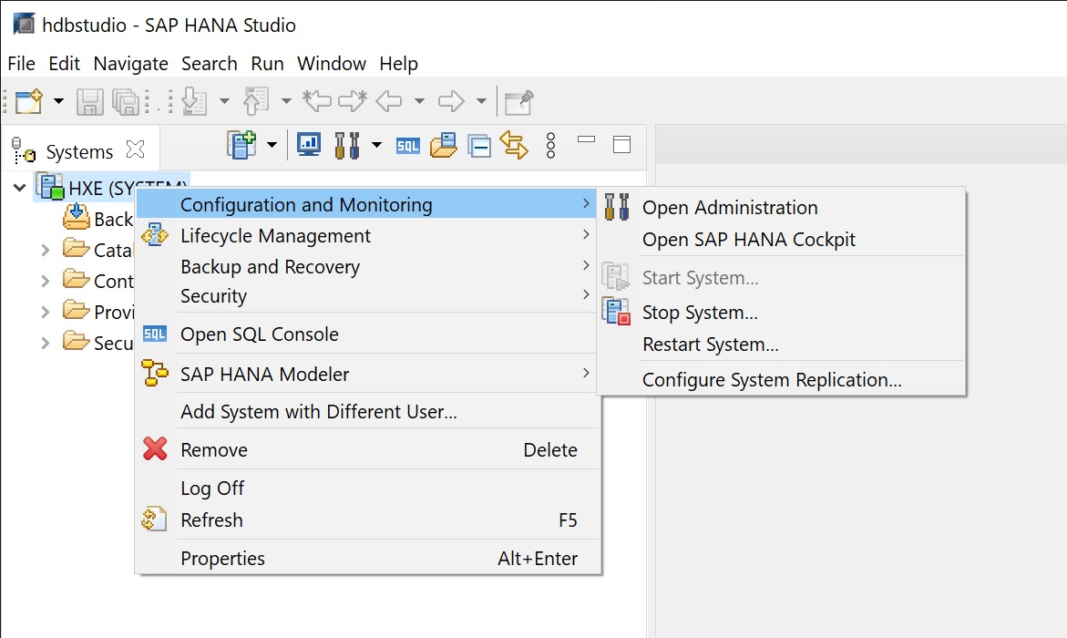 In this section we are going to take a look at the administration side of things, right-click the the system and select configuration and monitoring -> open administration