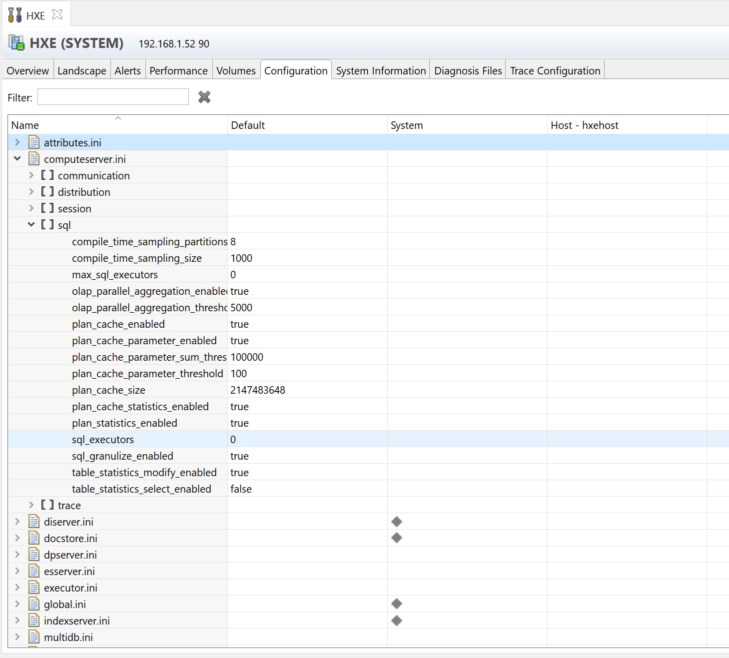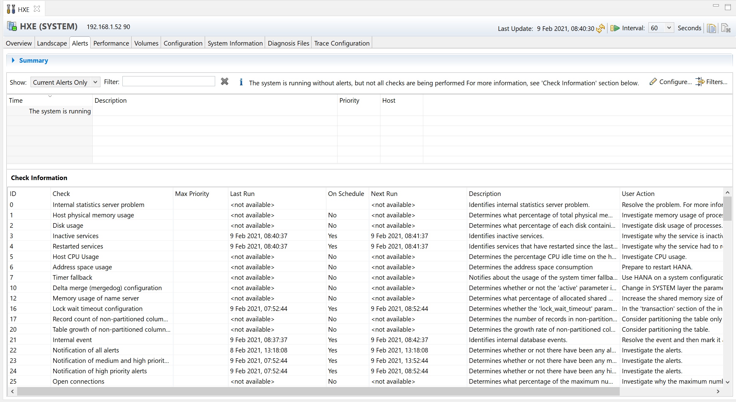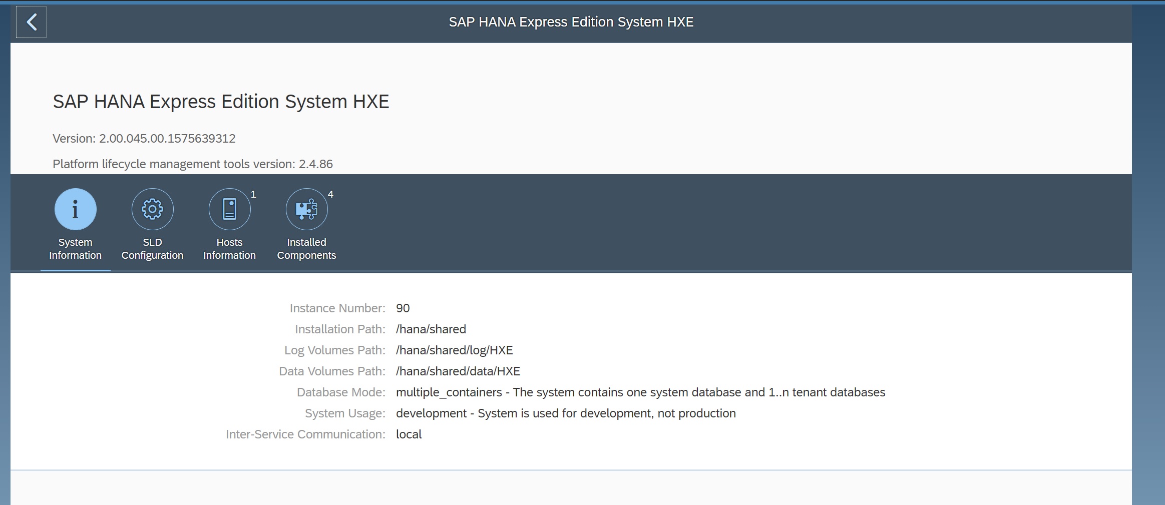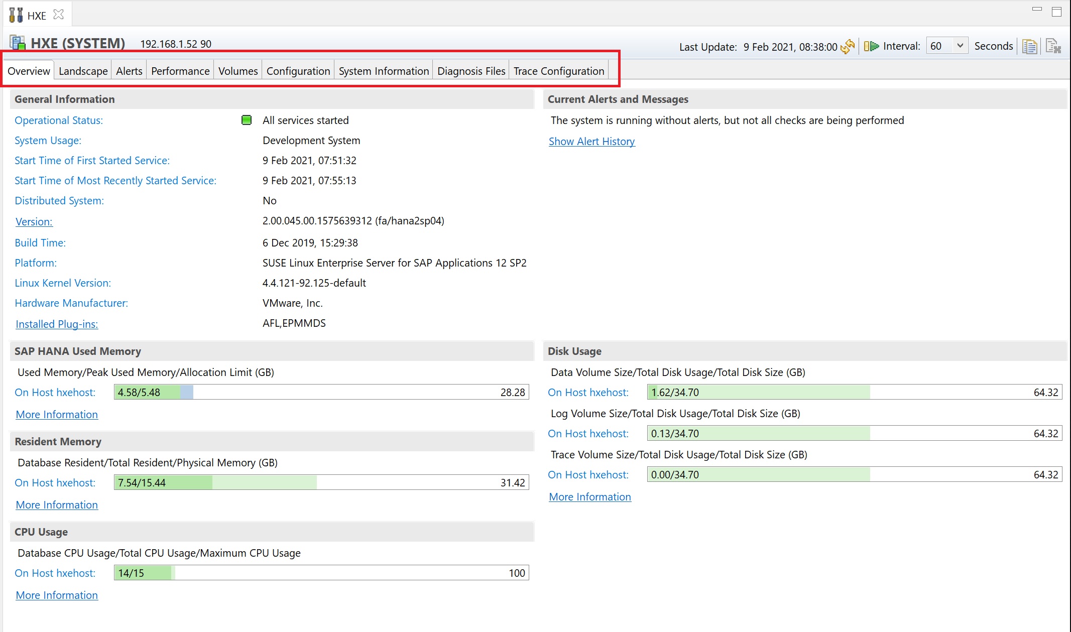 In the admin console there are many options which we will cover, the main screen details the mmeory used CPU usage and Disk usage, this is a good place to start if you are having performance issues with your Hana system. The eagle eyed will notice that the hardware manufacturer is VMware which is correct as I am running on a VMware platform. You can drill down in each section but clicking on the more information links.