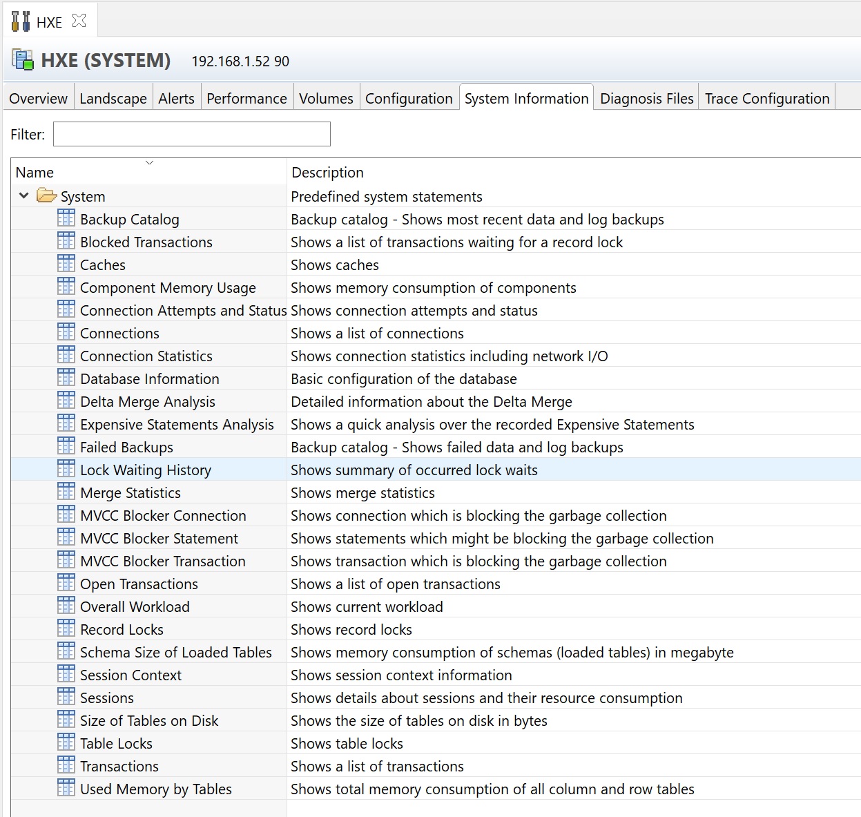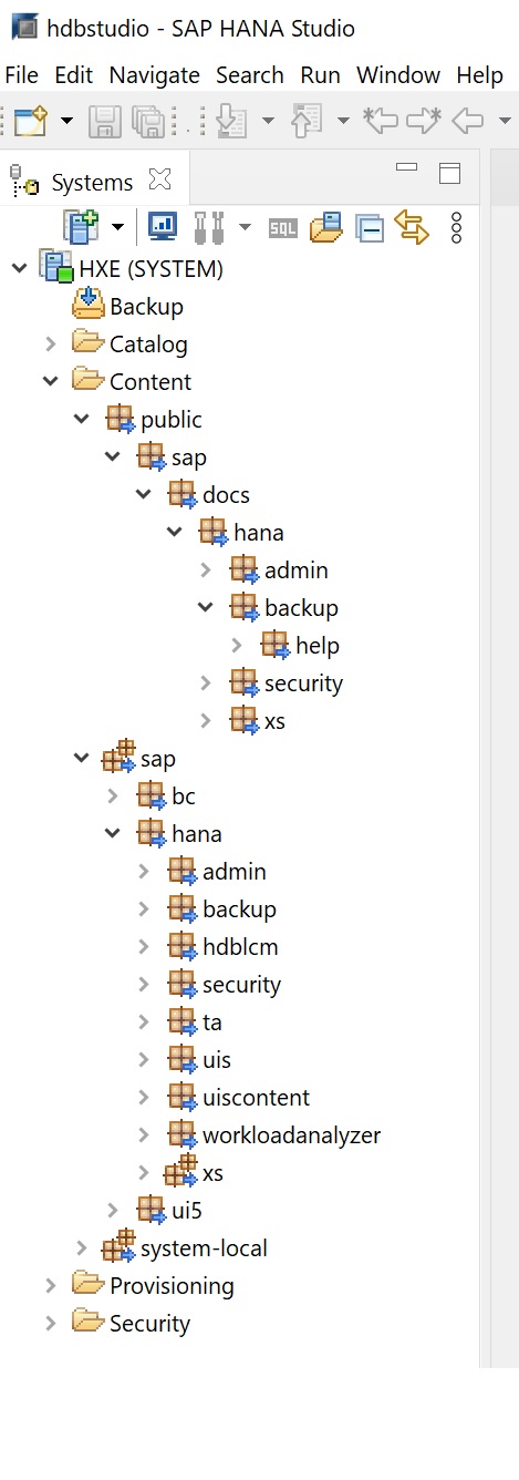 The Catalog represents SAP HANA’s data dictionary, i. e. all data structures, tables, and data which can be used. All the physical tables and views can be found under the Catalog node.