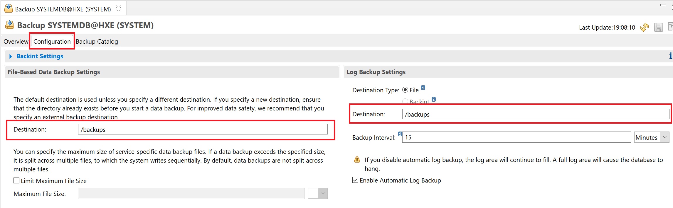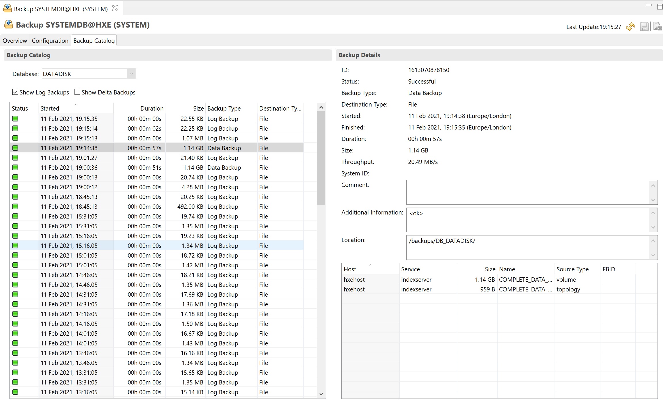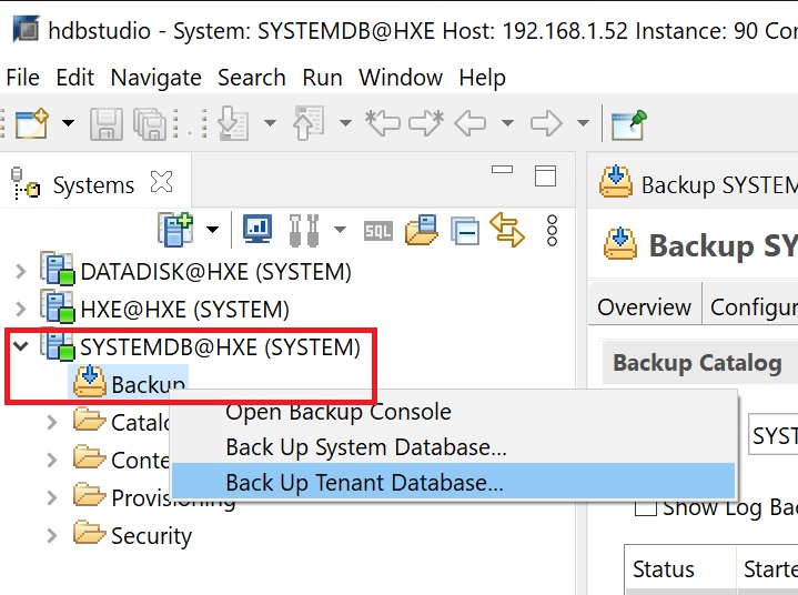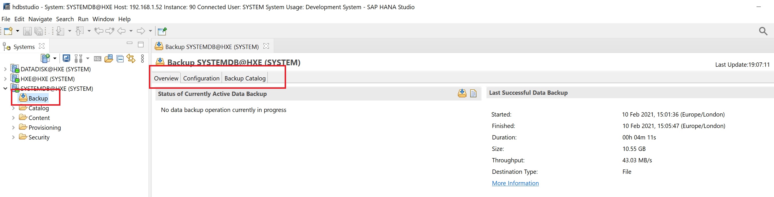 Returning to the Hana studio and right-clicking the system and select the backups, you are taken to the main backup screen, here we have three tabs the main backup screen, the configuration screen and lastly the backup catalog (backup history)