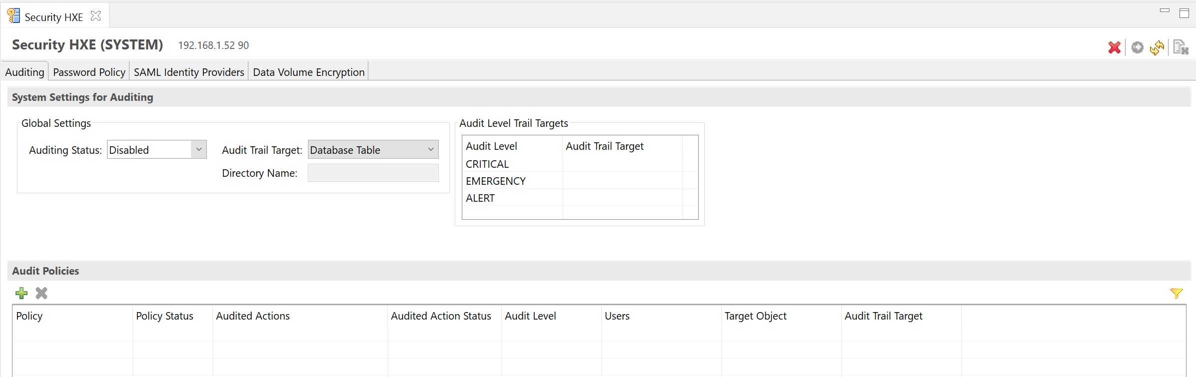 The security screen details audting password policy, etc. The auditing screen allows you to turn on audting for various components by specifying a audit policy.