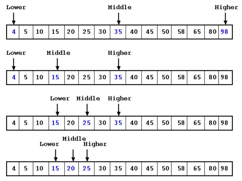Linear and binary are two search alogrithms, linear iterates over the array starting at the beginning searching for what you are looking for, O(n) is the time complexity. Binary search requires that the data be sorted, it chooses a element in the midlle of the array, if it matches the search is finished, if not then it compares if its greater than or less than and then it will search that side, it then search that half again, this repeats until the element is found, the time complexity is O(logn) as the array divides in half each time. The below diagram show how a binary search works