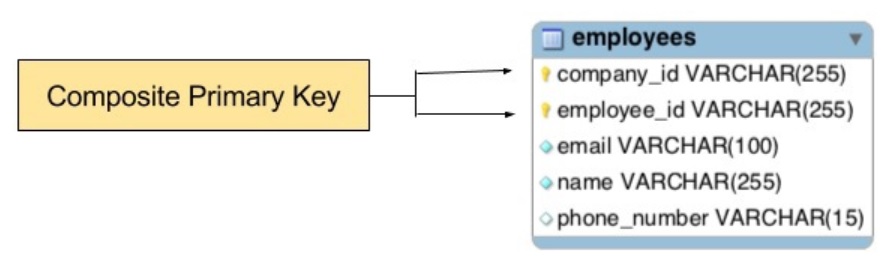Composite Keys are a combination of more than 1 table column that identifies the uniqueness of a record, normally we use a single primary key contained in a single column but instead we could use multiple columns as a primary key, in the below diagram we use the company_id and the employee_id to unqiuely identify a row in the table, so no two rows can have the same company_id and the employee_id's, In the entity we use the @EmbeddedId anotation. You also create equals and hashCode methods this allows the comparing of two objects and thus the uniqueness of a row.