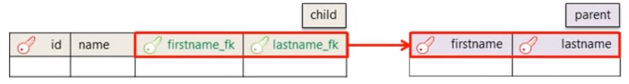In the example below the parent will have a primary key of both firstname and lastname, also the child class will use the @JoinColumns annotation to refrence the parent composite key. For forgien-key association you can use the below