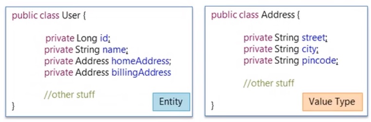 Entities and values types have a relationship where the entity has a primary key the value types are references inside the entity, as you can see in the below diaram the User is an entity and the Adress is a value type which belows to an entity. Value types are identified through owning entity. This means that if the entity is deleted then the value types of that entity are also deleted.