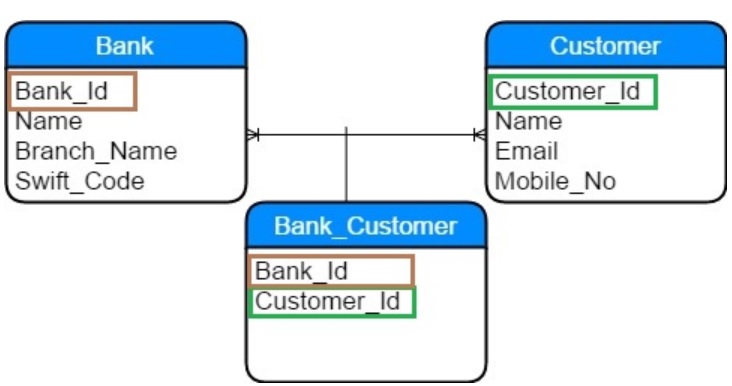 In a Many-to-Many relationship, both sides can relate to multiple instances of the other side, this also means that it has a bi-directional relationship, in the diagram below a bank can have many customers and the customer could be associated with many banks, we use the @ManyToMany annotation.