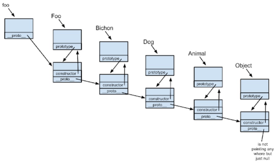 Javascript supports implementation inheritance which means properties and methods will be inherited, prototype chaining is used to implement inheritance, basically the prototype points to another instance of another type this means it has a pointer to another constructor, this can continue to multiple inheritance, you can see how this works in the image below