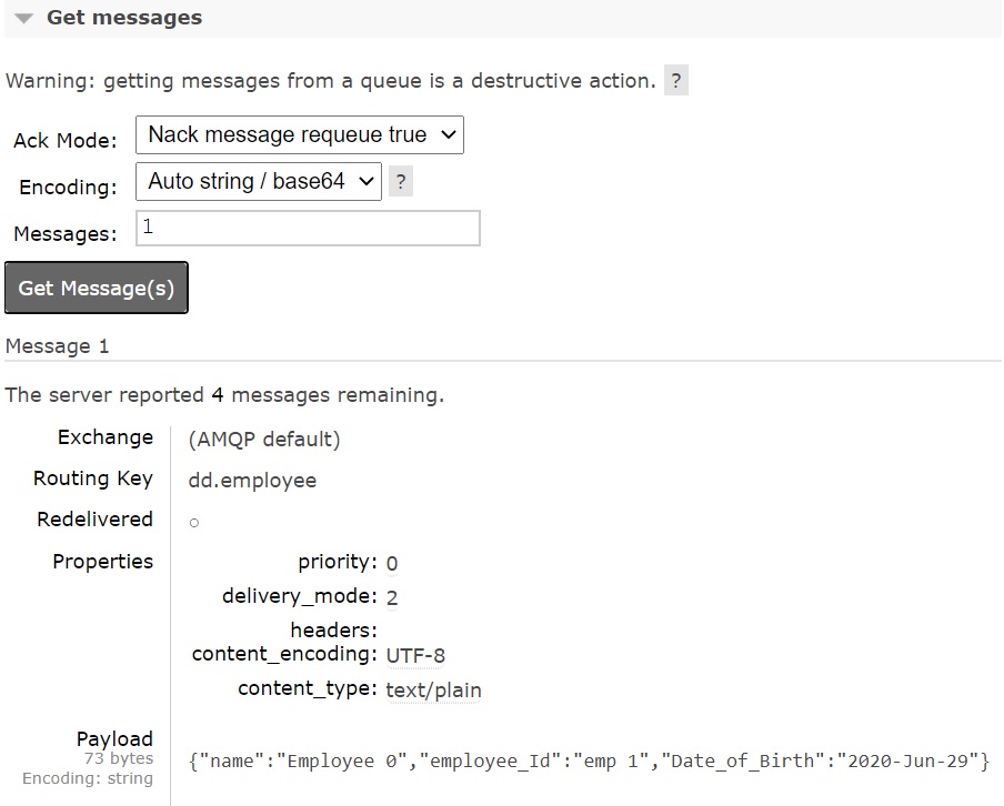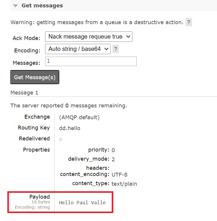 If we login to RabbitMQ go to the dd.hello queue and select get messages we can see our message