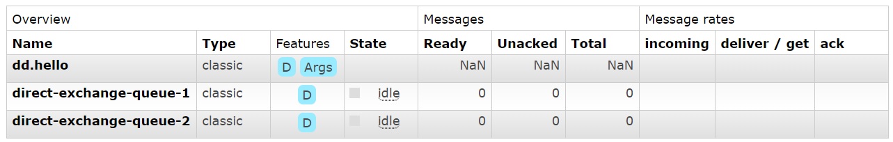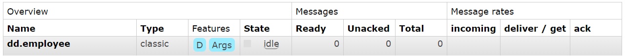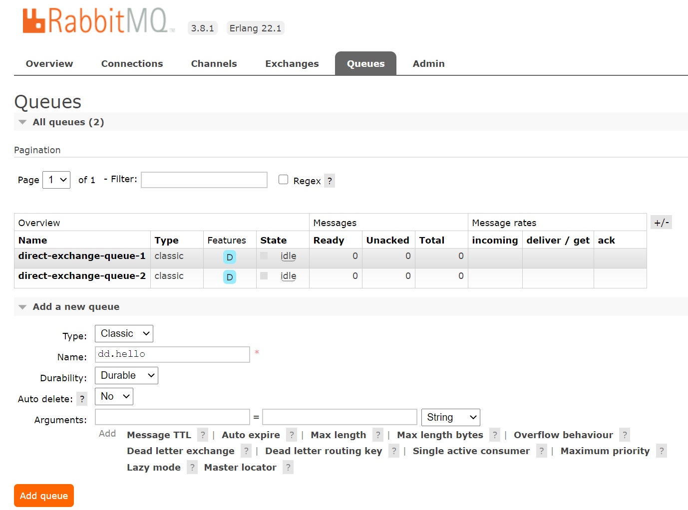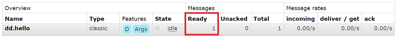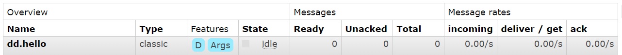 I have created a simple queue called dd.hello using the web GUI, just so that we can perform a simple connection and to create a message and consume it.