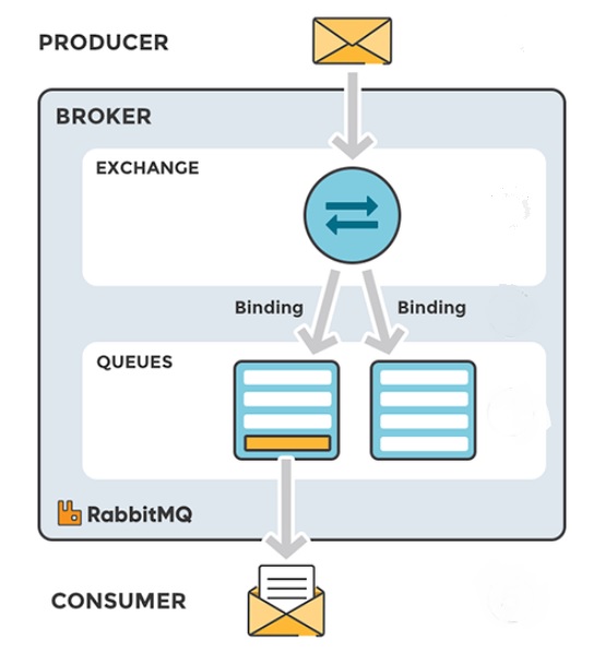 Basically the flow is that the producer sends a message to RabbitMQ, the exchange will examine the message and depending on the binding, route the message to the specific queue. The consumer will have subscribed to the queue and thus will consume the message.