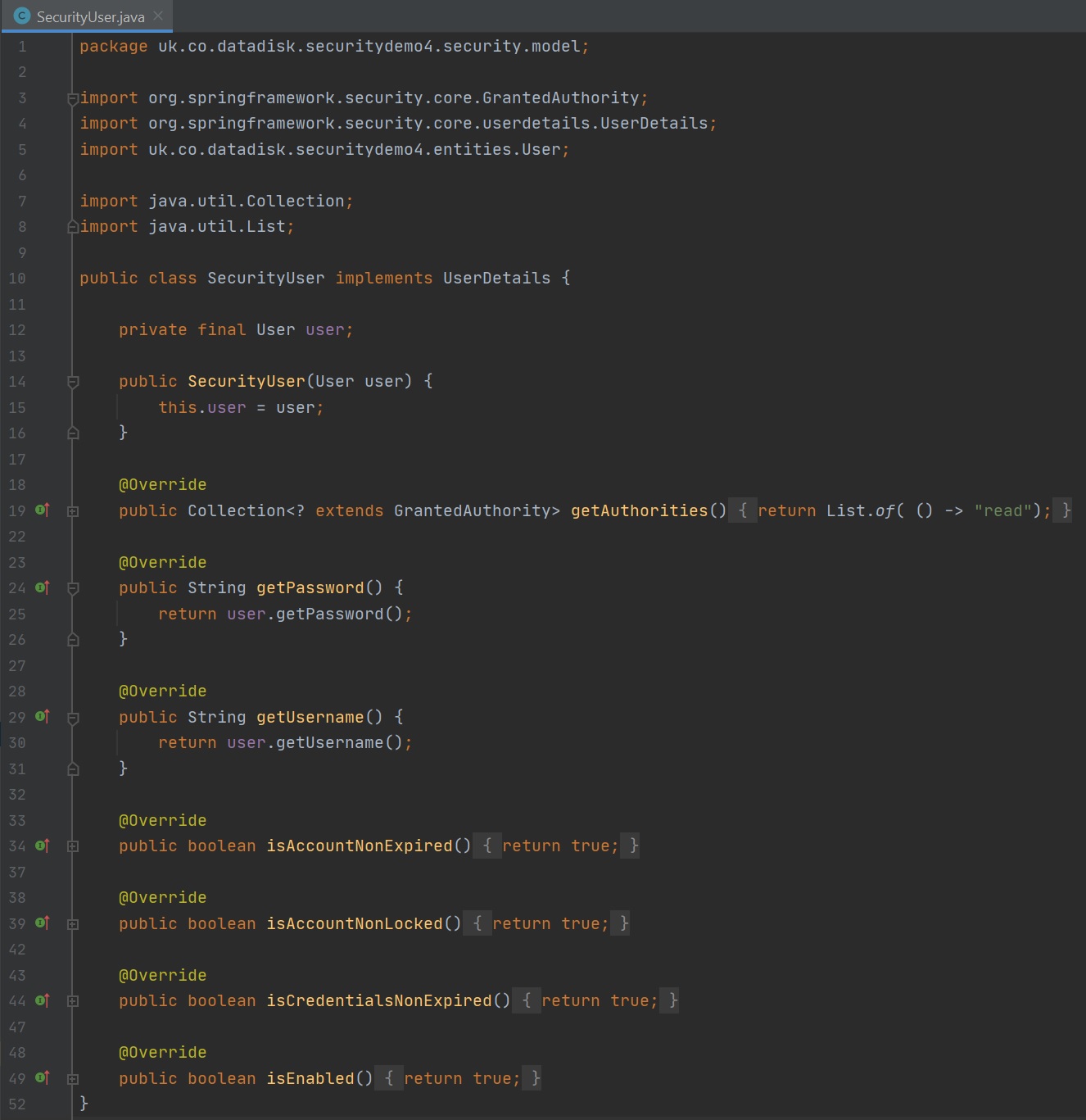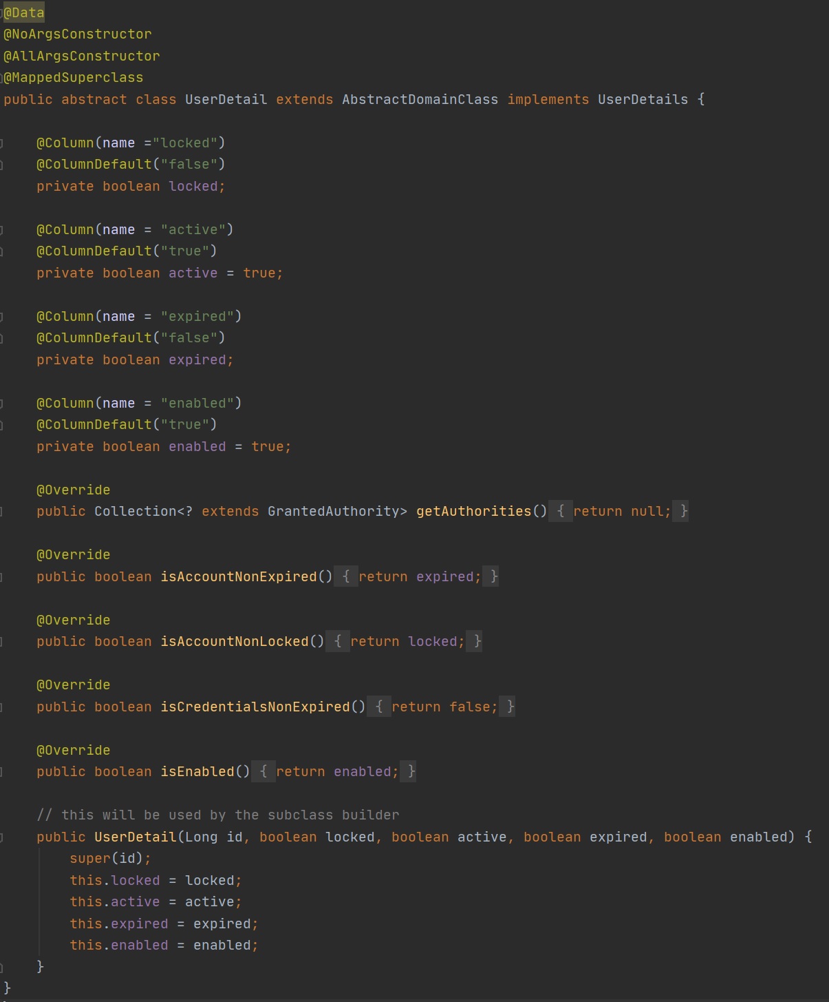 Lastly we extend the UserDetails class and which has the User entity, this class overrides the methods that holds the users authorities (roles) and can set if he account is expired, locked, credentials expired and if the account is enabled or not, all which you can either use or not use in your application. The one thing to note about this service is that it returns a UserDetails object which can then be used in your provider to obtain any of this information.