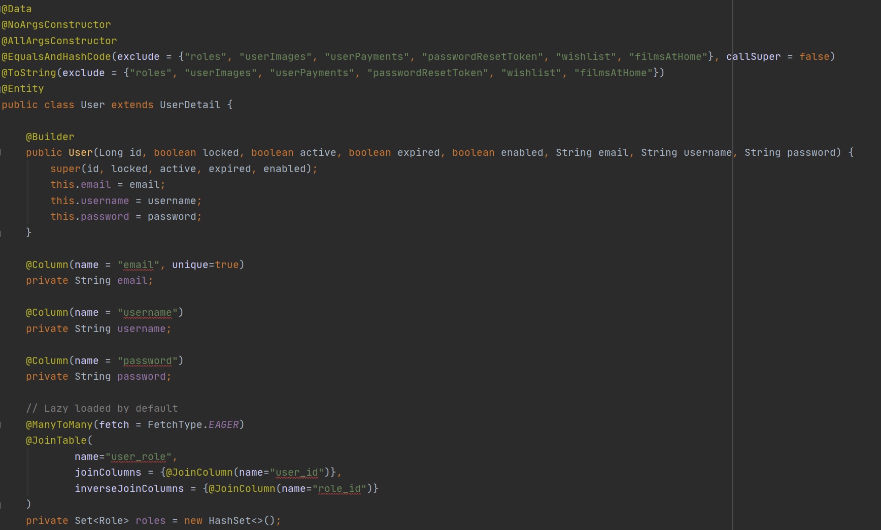 Below is the UserDetail class (left-hand screenshot) which I have added default values for specific fields, the User class implements the UserDetails class and makes use of roles which will have its own table.
