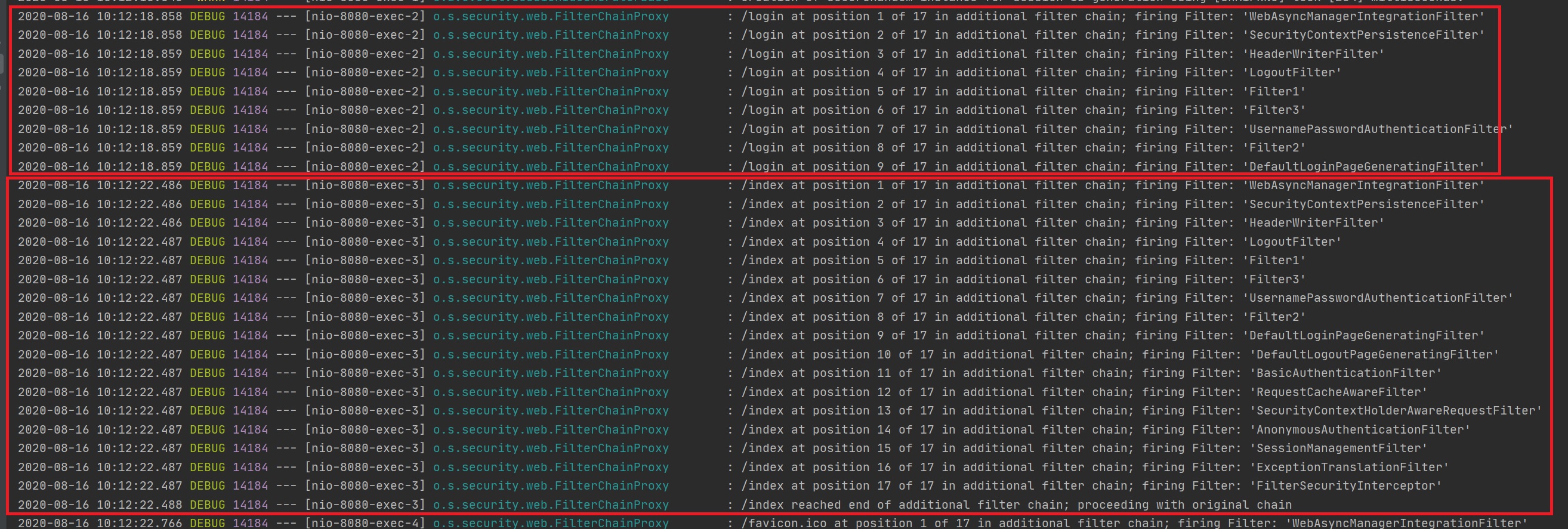 You can view the Spring Security filter chain (FilterChainProxy) and its order by setting the logging to debug in the application properties file (left-hand screenshot), then we you access the chain debug information will be displayed, depending on how the filters are configured some URL's may havbe different filters that it will use, however looking at the right-hand screenshot you can see that Spring Security already has a number of preconfigured security filters, you can also see my own custom ones as well (filter1, filter2 and filter 3).