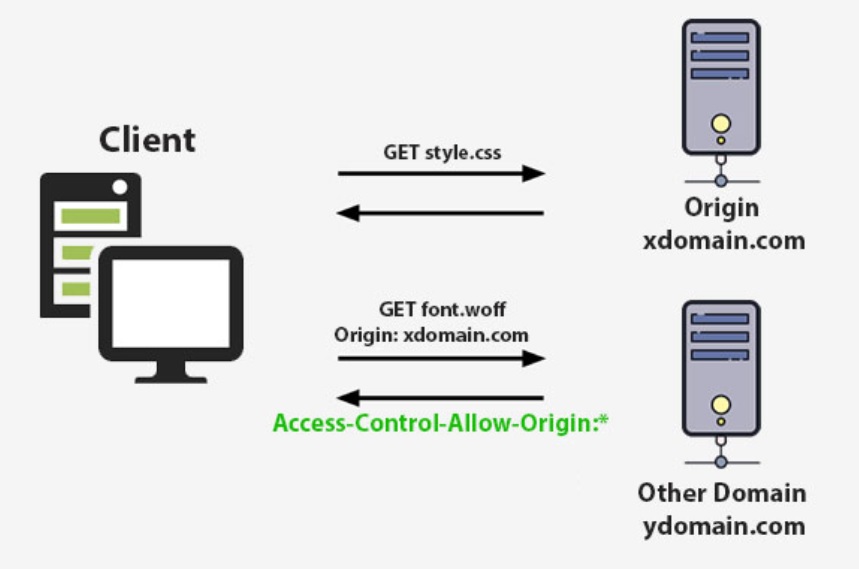 CORS is a mechanism that allows restricted resources on a web page to be requested from another domain outside the domain from which the first resource was served, in the example below the client requests the style.css file and in that file is a request to get the font.woff from another domain and hence the browser will complain of a CORS error.