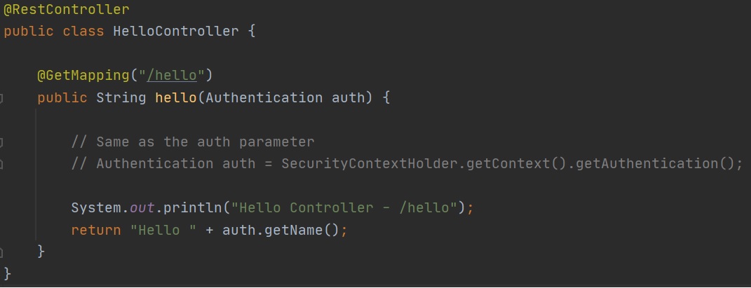 I also mentioned in the introduction that you can also add a authenticated object to the Security Context that then can be used in the controller (right-hand screenshot), an example of this is in the left-hand screenshot.