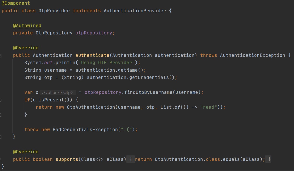 Now we have dicussed authentication filters we move onto the authentication manager and providers, first I will discuss providers which is the authentication implementation, we override the authenticate method which receives the authentication object we passed from the filters, this method is used to check the credentials and as mentioned above with either return a authenticated object or in this case throw a BadCredentialsException (which can then be handled). The supports method is used to register the type of authentication this filter handles, in this case a OtpAuthentation object. You can many providers that handle different types of Authentication classes.
