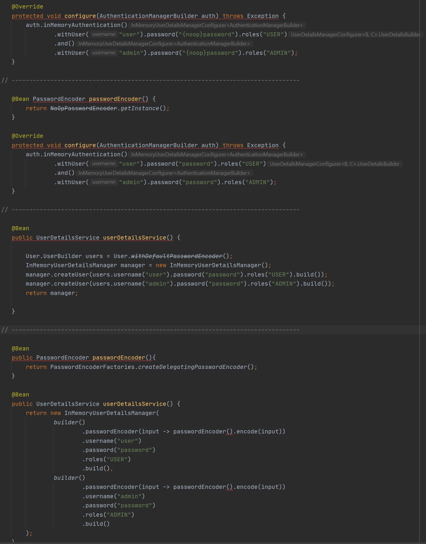 You are free to create your own password encoder bean which will override the default, the left-hand screenshot uses a BCryptPasswordEncoder of a strength of 5 (the higher the better but will take longer to create), sometimes while developing you might want to use a plain text password in the right-hand screenshot we use the NoOpPasswordEncoder