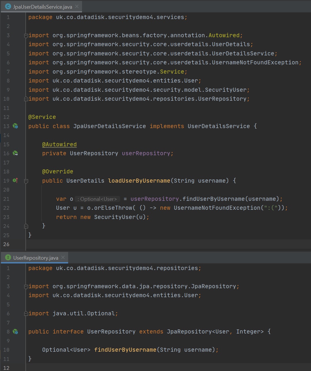 You might have noticed that a couple of the examples above use the UserDetailsService which is overridden using the in memory manager to populate a few users, so when authenticating spring will use this UserDetailsService to retrieve the user details. However you can also override this service when using a database, in the below example we implement the UserDetailsService and override the loadByUsername method, we wire in the User repository, all this service does is either return a optiona User or throw a UsernameNotFoundException. The User repository is configured to access a database.