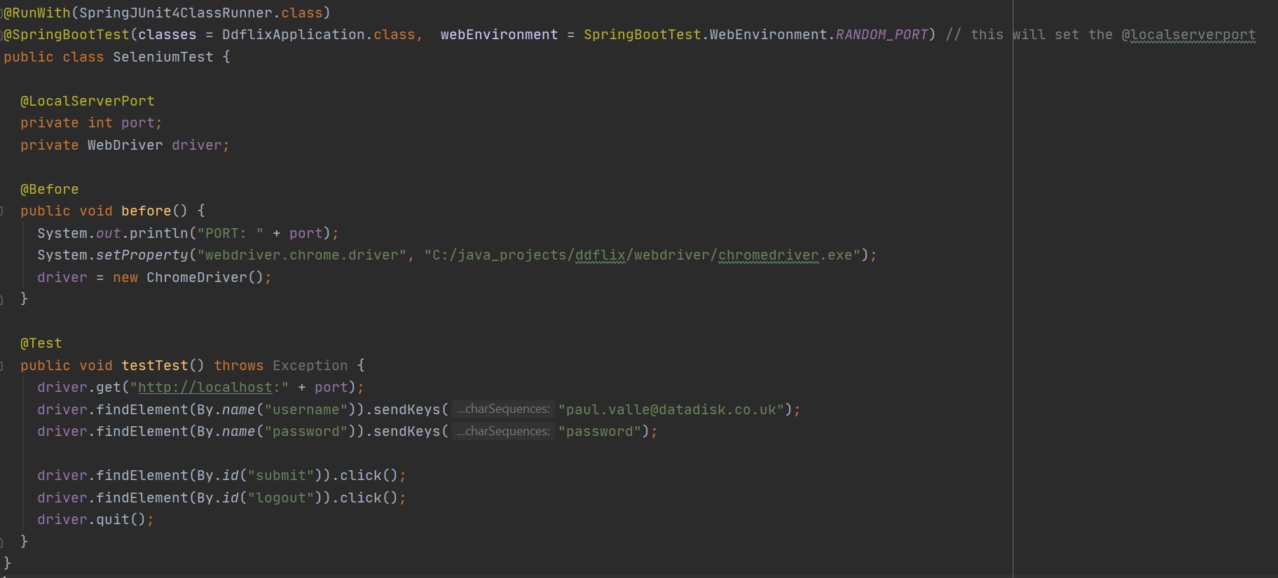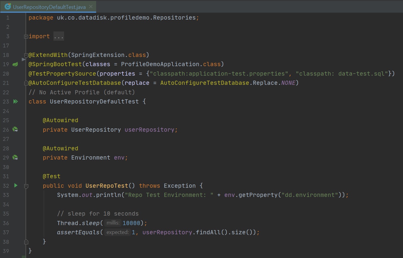 The default property file points to a profiledefault database, I also have a variable called dd.environment set to default if no profile is set then this will be used as the default. The test property file states it can be used by a test profile at the top (spring.profiles.active), we also set it to use a profiletest database and the dd.environment is set to test, also I have specified a data load script using the spring.datasource.data propery pointing it to data-test.sql