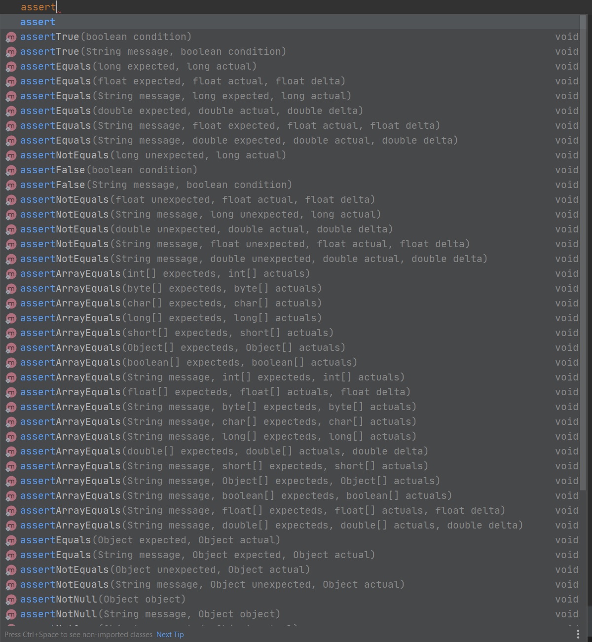 You can then use the assert method to test various parts of your code (left-hand screenshot), there are many assert test methods (right-hand screenshot)