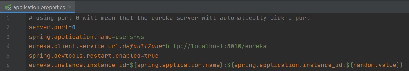 We then add the following application properties, using port 0 will mean that the Eureka Discovery Service will pick a port for us, this allows the coming and going of a user service if we decide to use multiple instances (Eureka will manage the port numbers for us), we give the application a name and a URL, we use devtools to restart our application to restart if changed (remove for production), the eureka instance id allows you to run multiple instances of the same services.