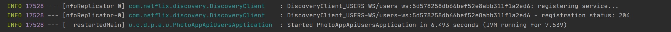 When we start the user service we can see it connecting to the Eureka Discovery Service