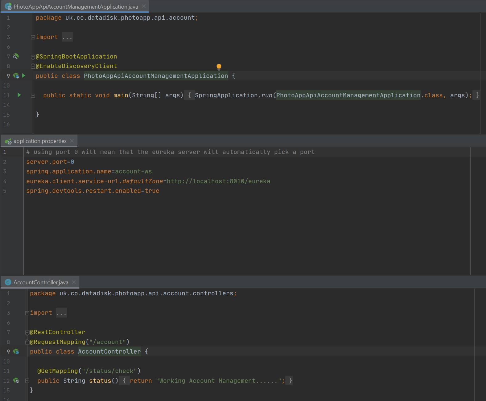 To add other microservices you can simple follow the setup below, this is an example of a Account Management service (not fully configured), simple add the @EnableDiscoveryClient annotation, update the properties and create your controller/service/repository to hook into the Eureka Discovery service. You can slice and dice the application up into whatever services that you need, remember try and keep them small and focused on one task.