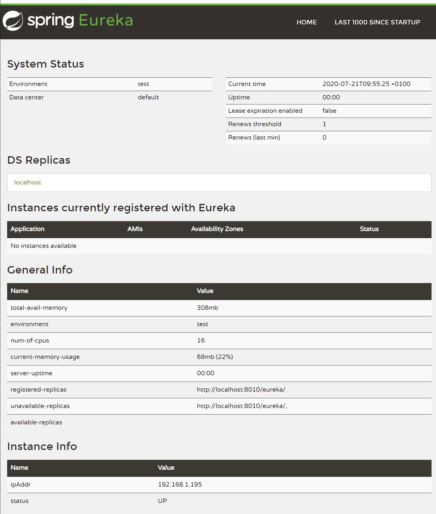 Thats it (pretty simple), when you start the application and go to the URL specified in the properties file you should see something like below, which is the Eureka Discovery Service Dashboard. You can setup the Discovery Service to have replica's for fault tolerance, as you can see we have nothing that is registered yet, in the bootom half we have some general information and the instance information about the service.
