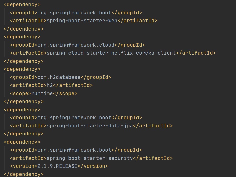 Lets build a simple user microservice, I am not going to cover everything regarding the Spring Boot app itself but only focus on the Spring Cloud parts, the dependency that you need is the Eureka client as per below but as you can see its a web application, and I will be using a H2 database, we will also touch on security later in its own section.