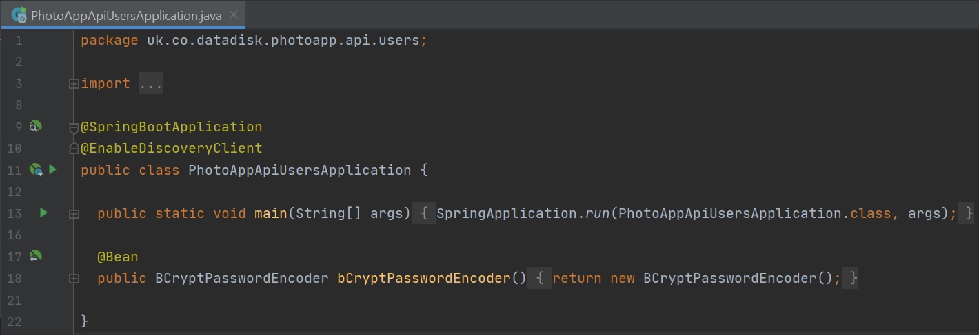 To make this a Eureka client we use the @EnableDiscoveryClient annotation
