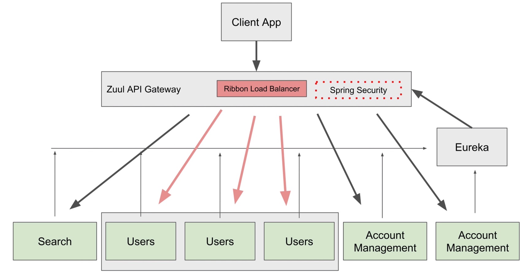 Zuul is an L7 application gateway (Edge service) that provides capabilities for dynamic routing, load balancing (Ribbon) monitoring, resiliency, security, and more. So how does Zuul API Gateway fit into the picture, Zuul will provide the entry point into the application, it communicates with the Eureka Discovery Service to obtain what services are available, we then use Ribbon a load balancer built into Zuul to handle any loading balance to services that are running multiple instances, lastly Zuul can also use Spring Security to for example make sure that a JSON Web Token (JWT) is in the header before allowing to have access to service for instance (make sure the user is authenticated).