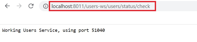 Now we can access a microservice via the Zuul Gateway using the URL http://localhost:8011/users-ws/users/status/check, we get a response back from the users-ws microservice.