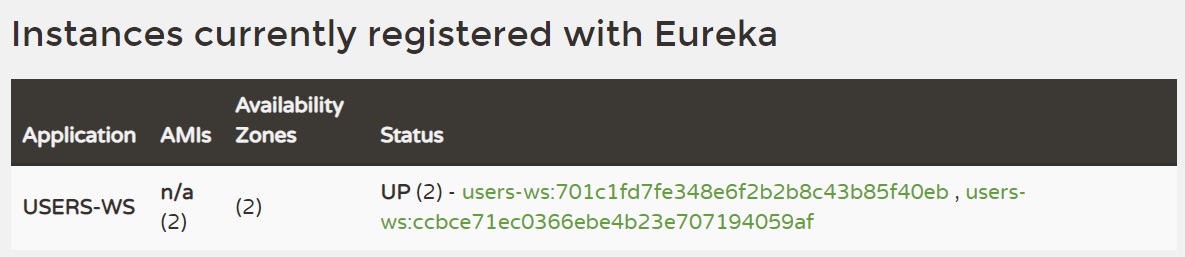 As I mentioned in the Eureka setup if you configure a instance id in the Eureka client you can start multiple services as seen below, using the URL http://localhost:8011/users-ws/users/status/check will flip between the two services using the provided Ribbon load balancer.