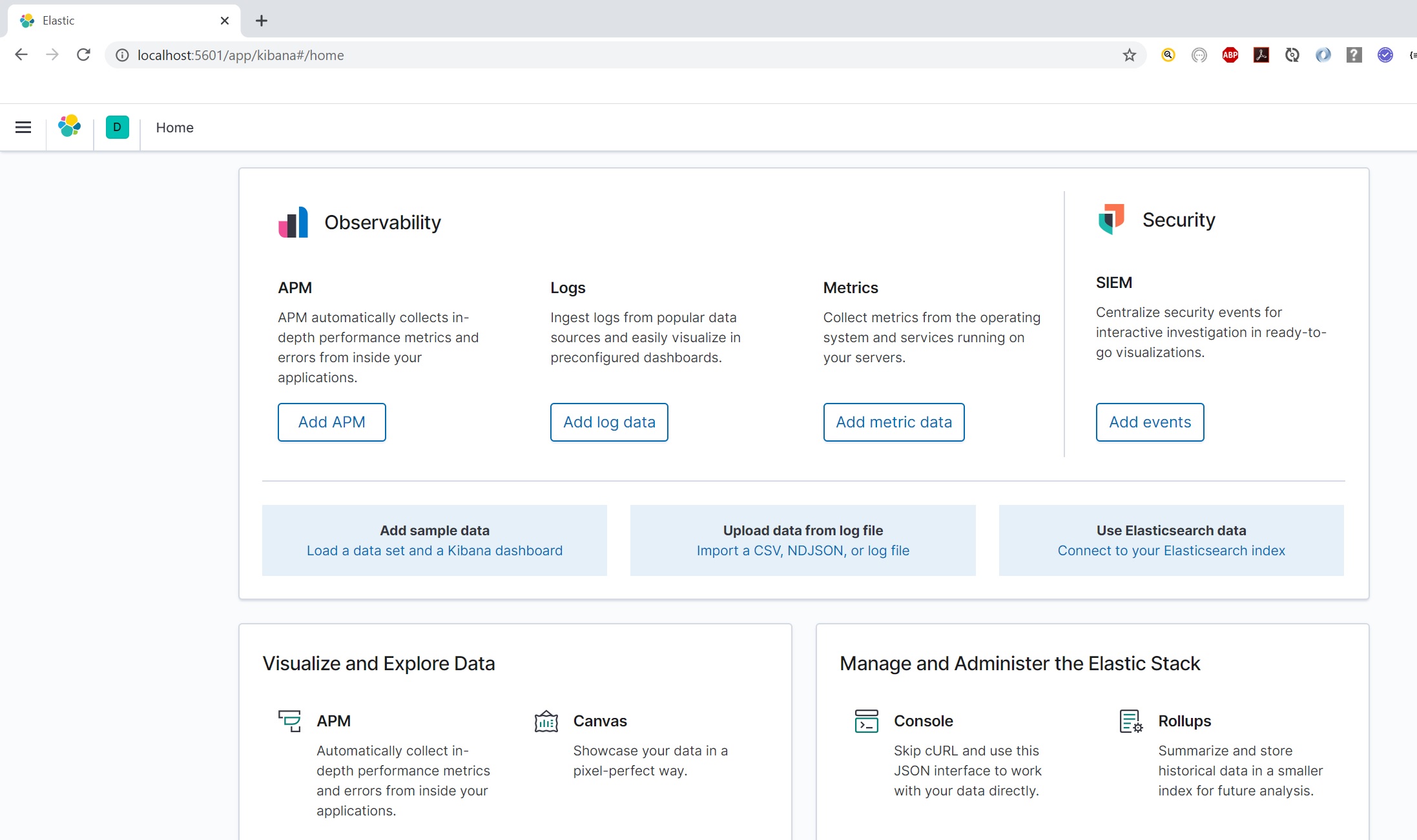 Go to the URL http://localhost:5601 and hopefully you should see the screen below