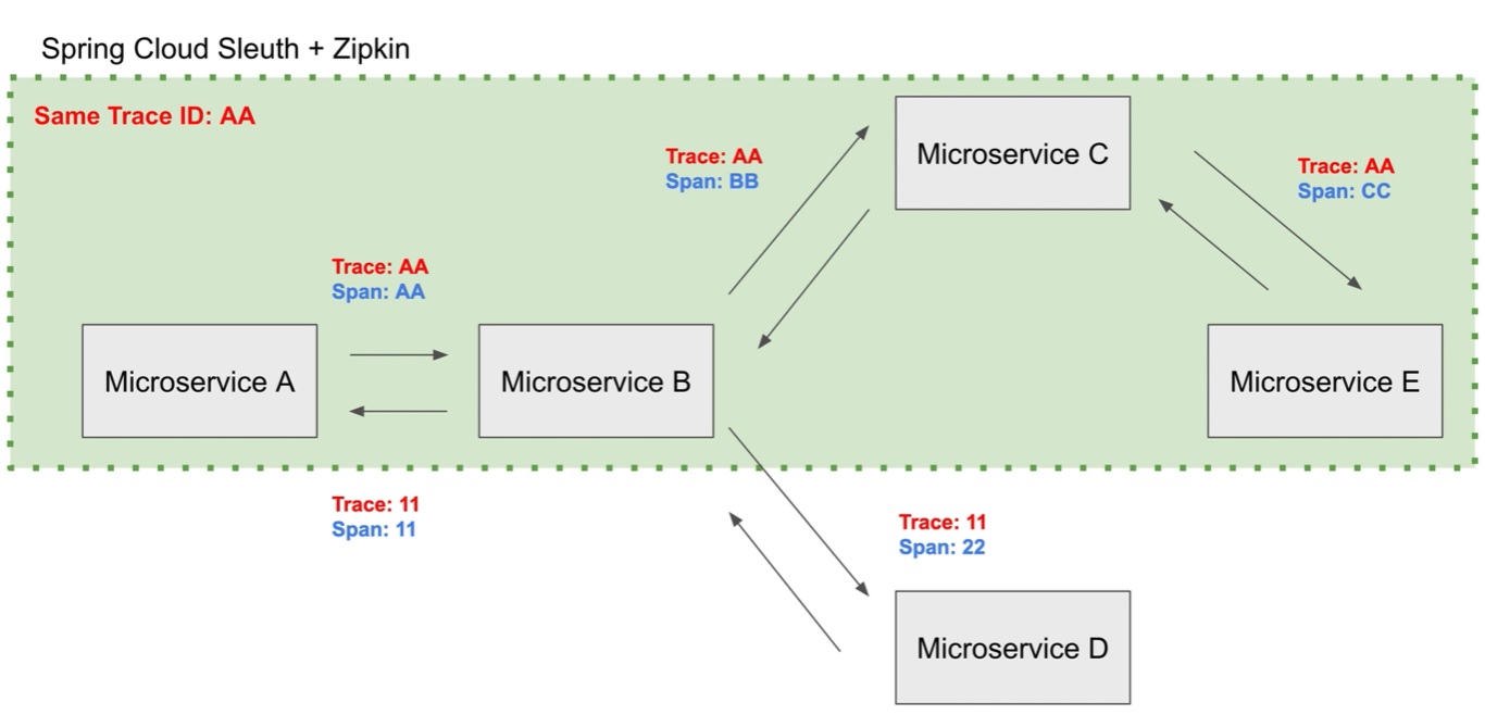 It would be idea if we could trace where mircoservices are having issues or are slowed, or having communication issues, etc, this is were Sleuth and Zipkin can help, basically a trace and span id will be attached and logged enable you to be able to trace a service call, a Zipkin server can then receive these logs and display then in a friendly graphical user interface. The span id will change when the call pass from from microserivce to microservice, the trace id will remain the same and thus you can trace from the original start of the call to the end.