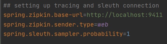We then need to add some properties regarding the location of the Zipkin log server, the first two properties define the zipkin lcoation and what type of data to send web being HTTP, the last property is what level of detail to send, 0.1 means 10% of infromation will be sent, 1 means 100% of information to be sent.