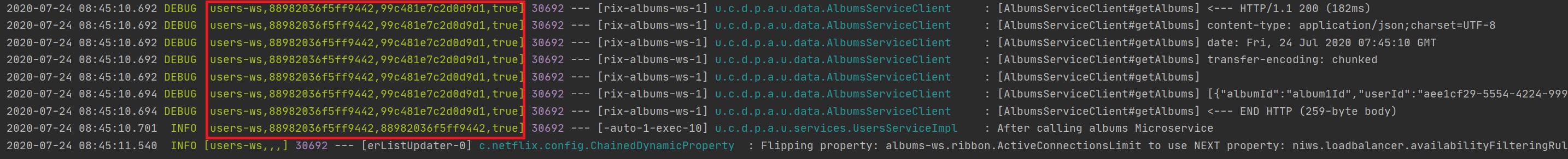 The additional logging can be seen below, the first field is the microservice name, the second field is trace id (the same id will be used) and then we have span id and the last field is if the log information will be sent to the zipkin server.