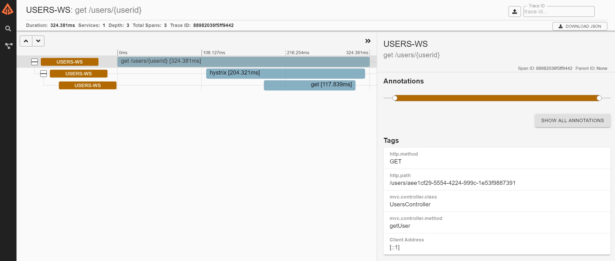 I have downloaded the zipkin server executable and started it on my windows 10 laptop, then restarted the Users application
