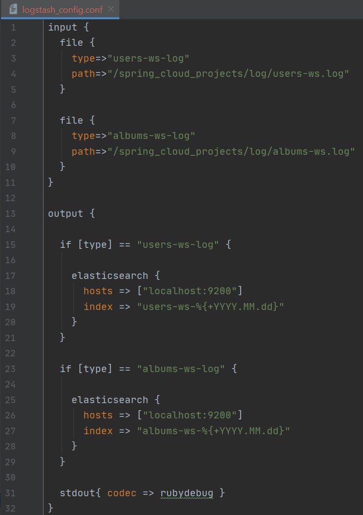 Download logstash and unpack it, in the bin directory we need to create configuration file, that looks like below, we have two inputs which point to the microservices logfiles, which we setup above and a output which is pointing to the elasticsearch server which will be setup below