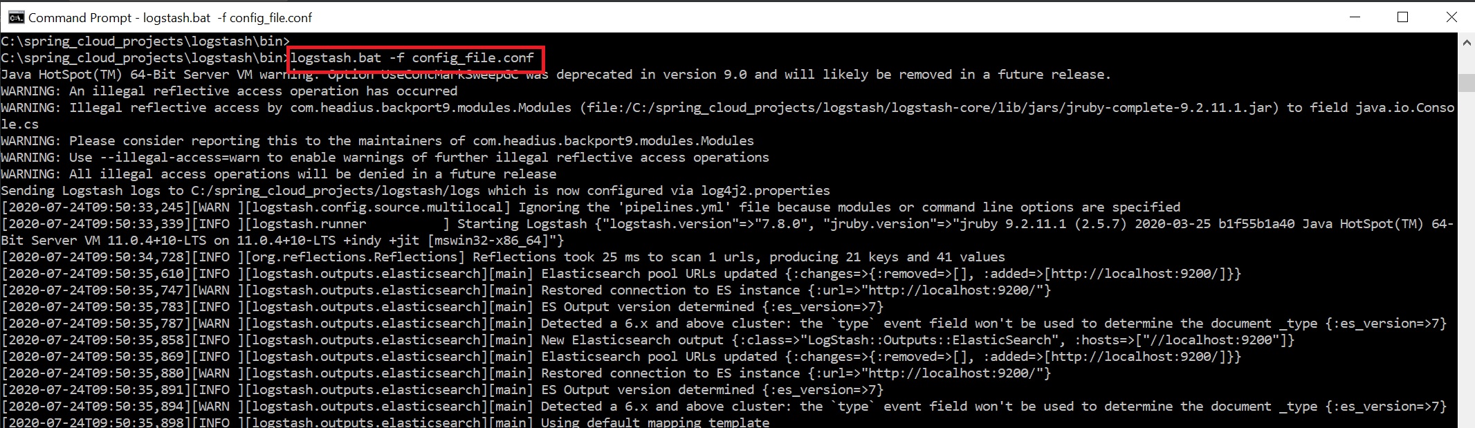 Now start the logstash server using the command logstash.bat -f config_file.conf (I am using windows 10)