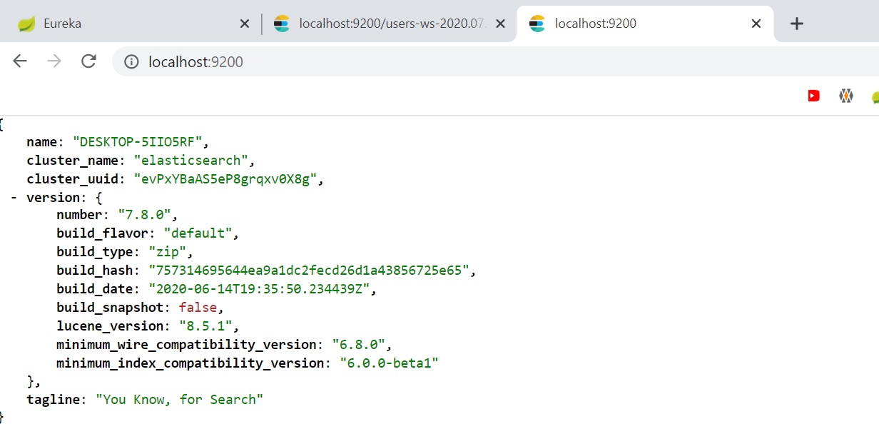 We can open up the elasticsearch application using the http://localhost:9200 and you should see below