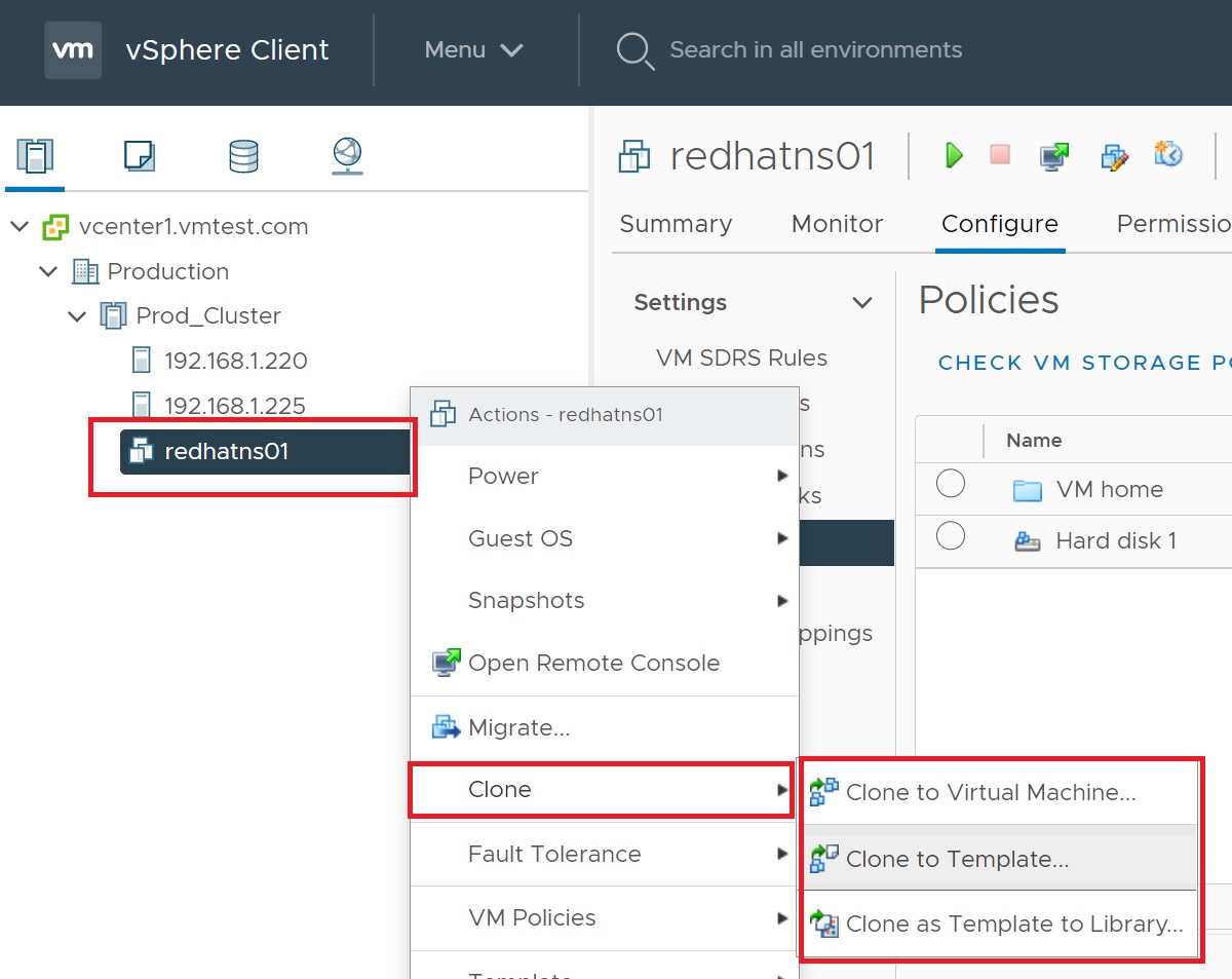 | Clone Virtual Machine | This merely copies a VM, you cannot compress the size of the VM (unlike Clone to Template) and you cannot quickly update the base VM (unlike convert to Template) |