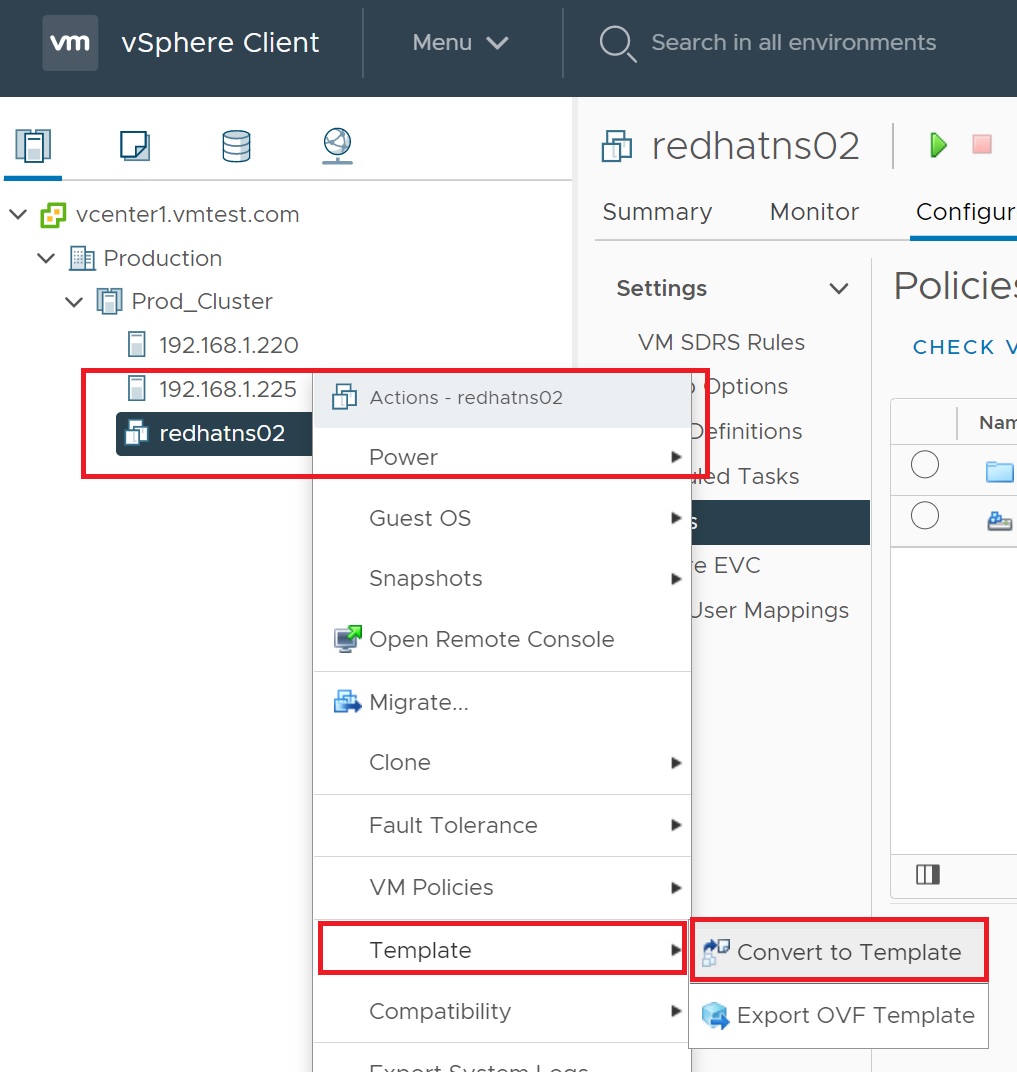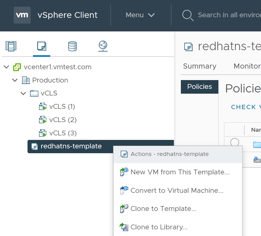 | Creating a new VM from a "cloned to Template" | Hightlight the template and right-click then select New VM from this Template