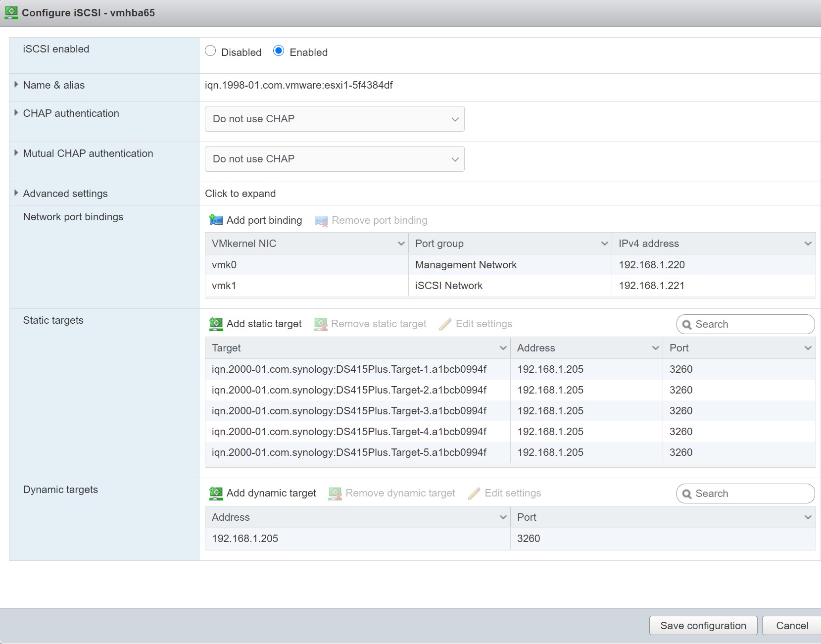 On the nested ESXi servers i setup the iSCSI as per below, I have added two more additonal LUN's to the Synology SAN, this will be used by all the ESXi servers in the cluster and thus all servers will have access to all the created VM's.