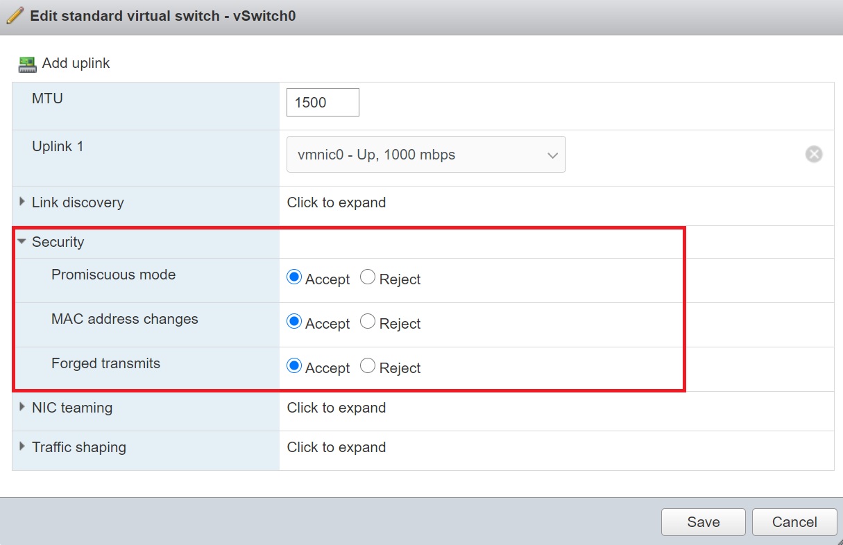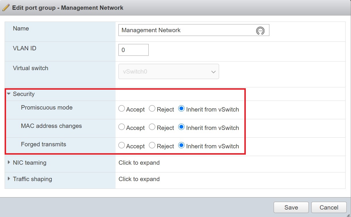 Before we start setting up the first nested ESXi server we have to allow access to the underlying network, any vSwitch or Port group must allow access to promiscuous mode, MAC address changes and Forged transmits either explictly or from inheritance.