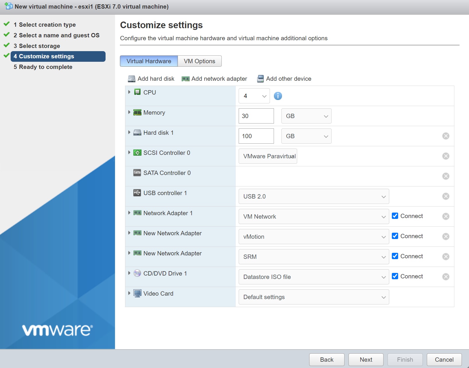 Setting up a nested ESXi server is as simple as creating a VM and pointing the cd/dvd to the ISO image and then installation ESXi as you would normally do giving it it own unique IP address. Give the VM a name and make sure that you select the the Guest OS family as other and the Guest OS version as VMware ESXi 7.0 or later