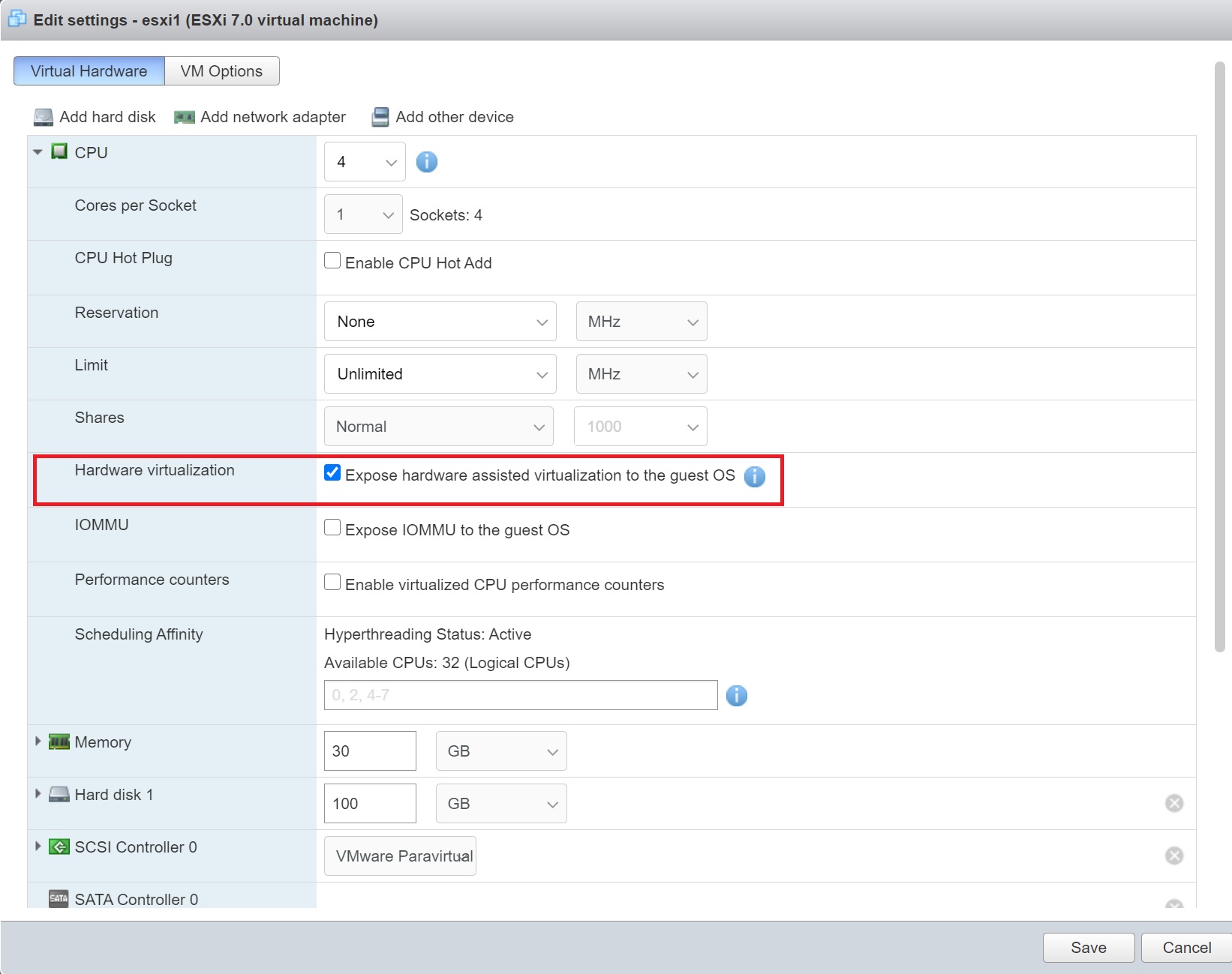 Next in the CPU drop down section, I expose the hardware for the assisted virtualization to the Guest O/S, this allows any Guests hosts you create in the nested ESXi server access to the physical server, so to summarize a Guest OS goes via the nested ESXi which goes via the ESXi server which has access to the physical server.