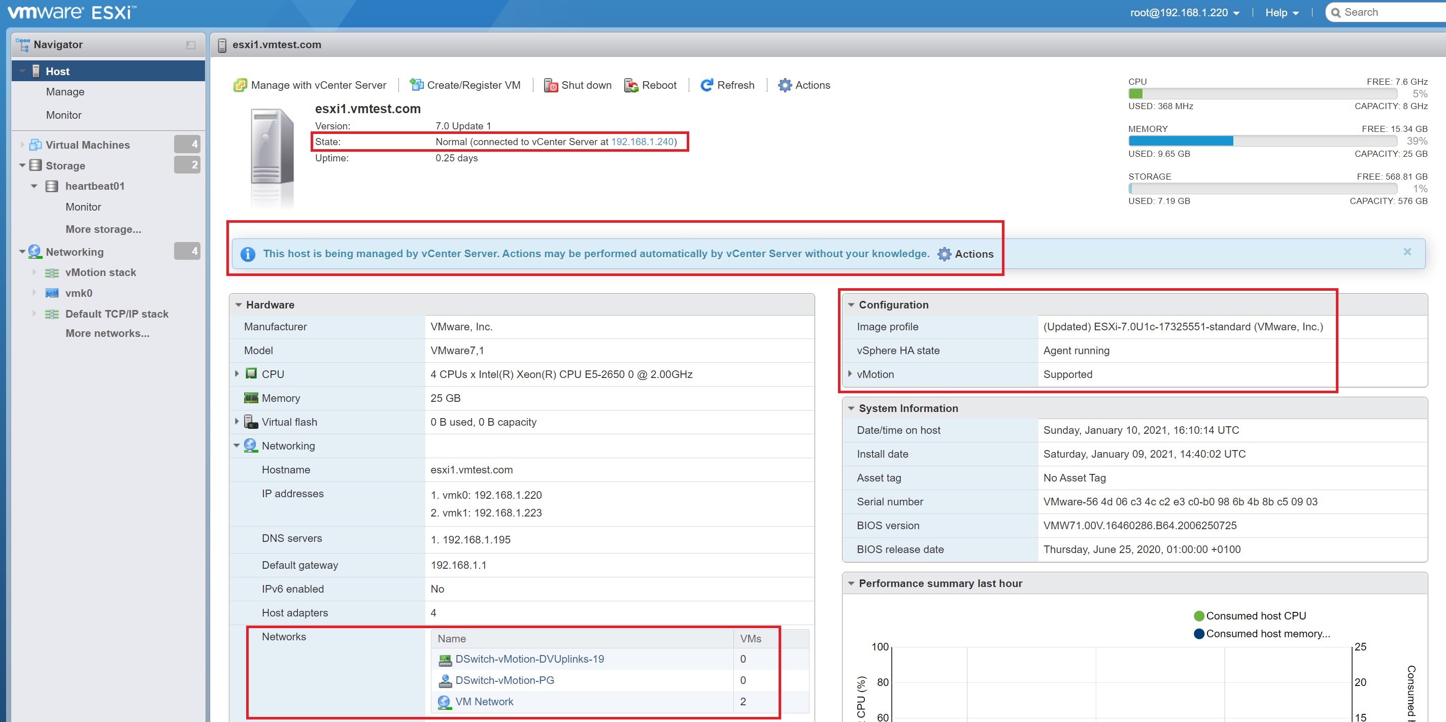Once you connect the nested ESXi servers you will see that the state is now controlled by the vCenter server and you may or may out see the message in blue.