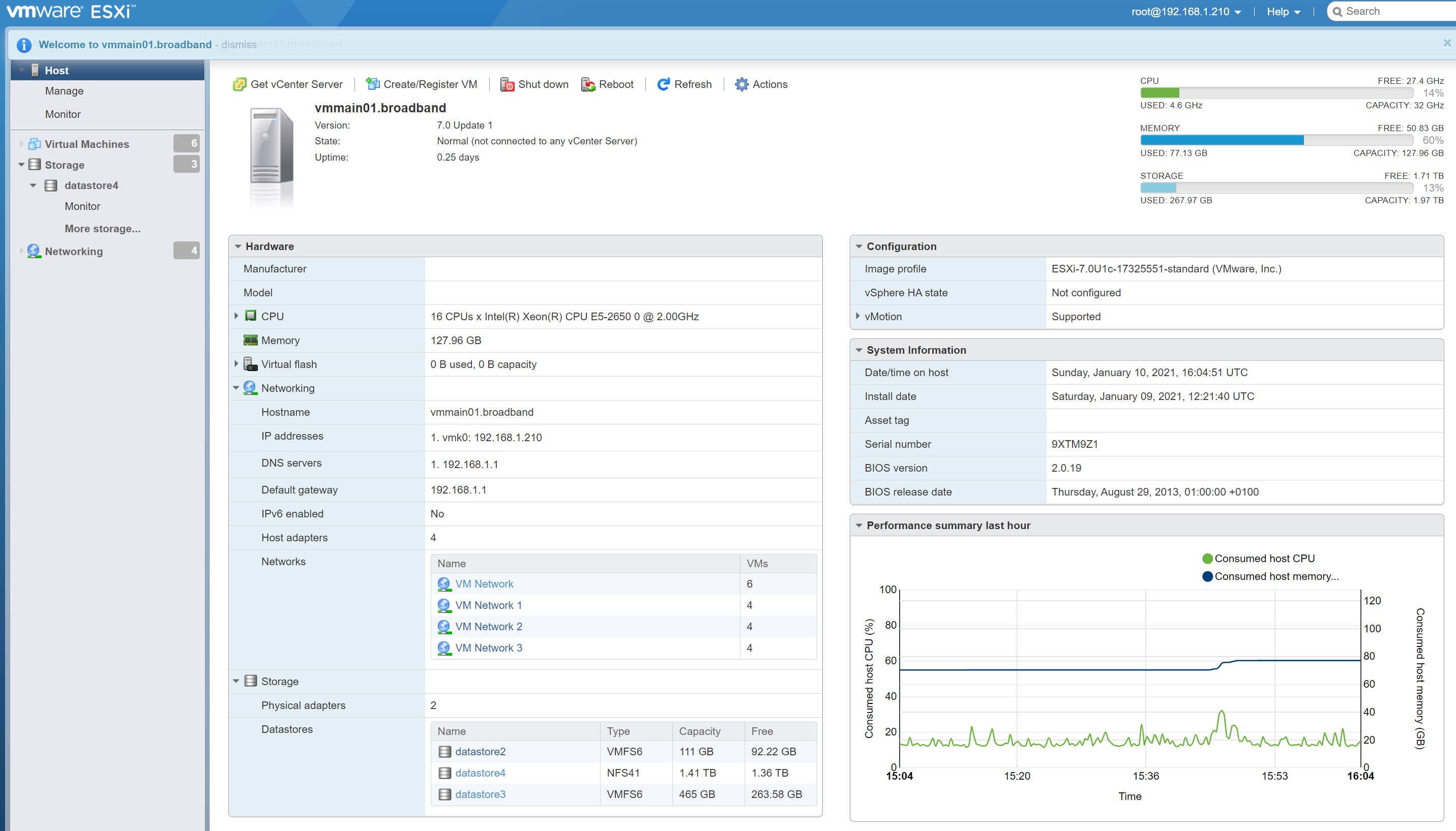 As mentioned above my main ESXi server (which will host the nested ESXi servers) is a DELL R620, I am using the lastest ESXi 7.0U1c release as of 01-2021. I have 120GB and 32 vCPU's to play around with which is more than enough to test Replication and SRM.